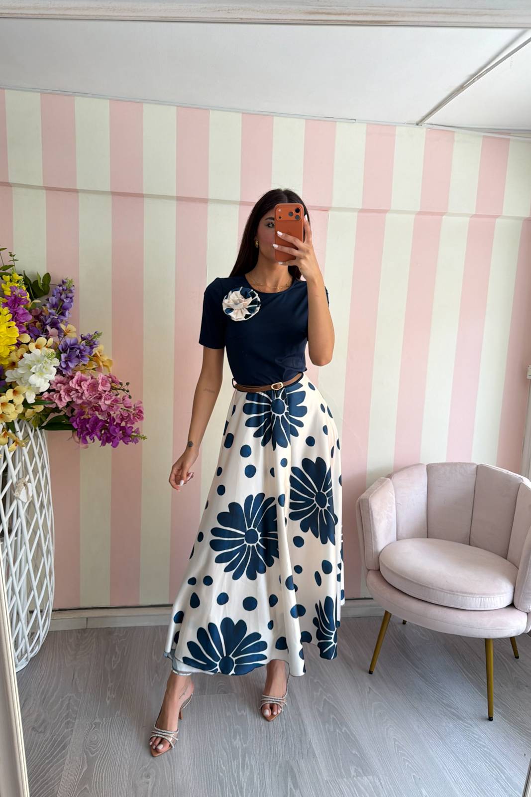 Dettaglio spilla con fiore, cinturino in eco-pelle