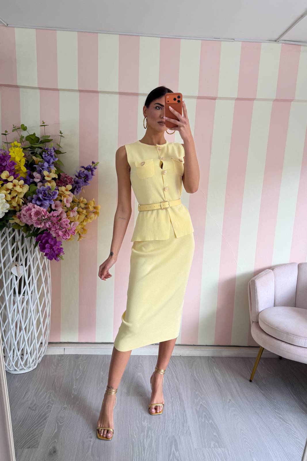 Cardigan smanicato con abbottonatura frontale, dettaglio bottoni gioiello